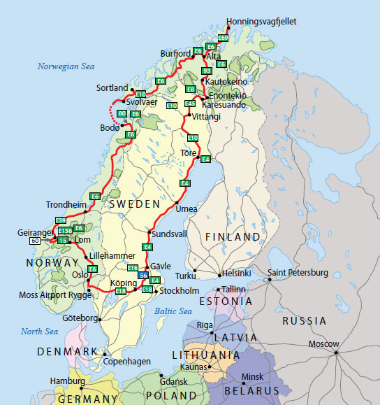 Leaving Umea at 8 a.m., we are back on the E4 until we arrive in Tore where we hit E10 to Vittangi. Well into our journey, we have passed the 1,000-mile mark and reach the Arctic Circle. We take it as a good omen when we sight our first reindeer along the roadside. We stay in a comfortable cabin again, and the farther north we go, the cheaper they become. The Midnight Sun is becoming obvious.