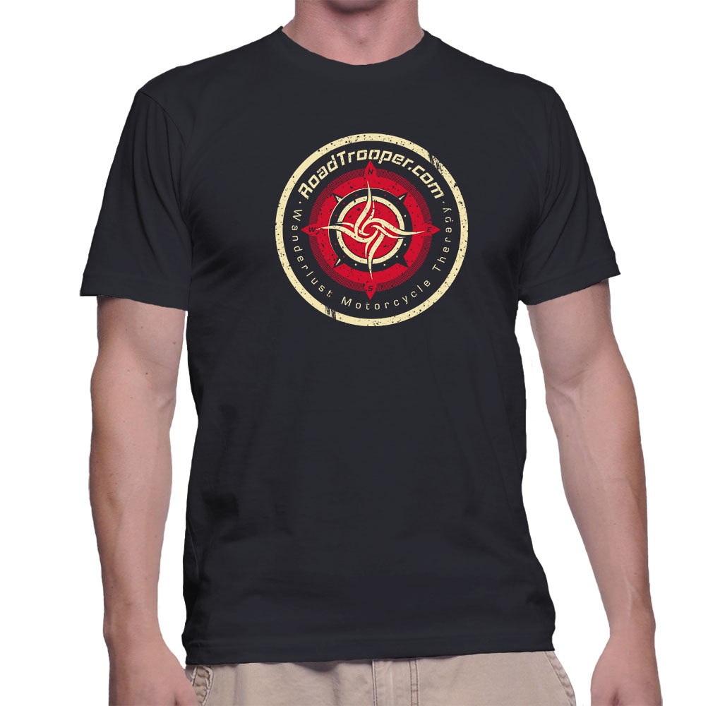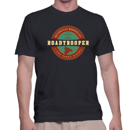 RoadTrooper Dual-Sport Nomad 2016. I designed this one from myself as mixing road and trails is my particular flavor of motorcycling, but as a few others liked the design I thought I’d share. This t-shirt is available in the following colours: – Black (see model) – Dark Navy – Navy – Shop Now