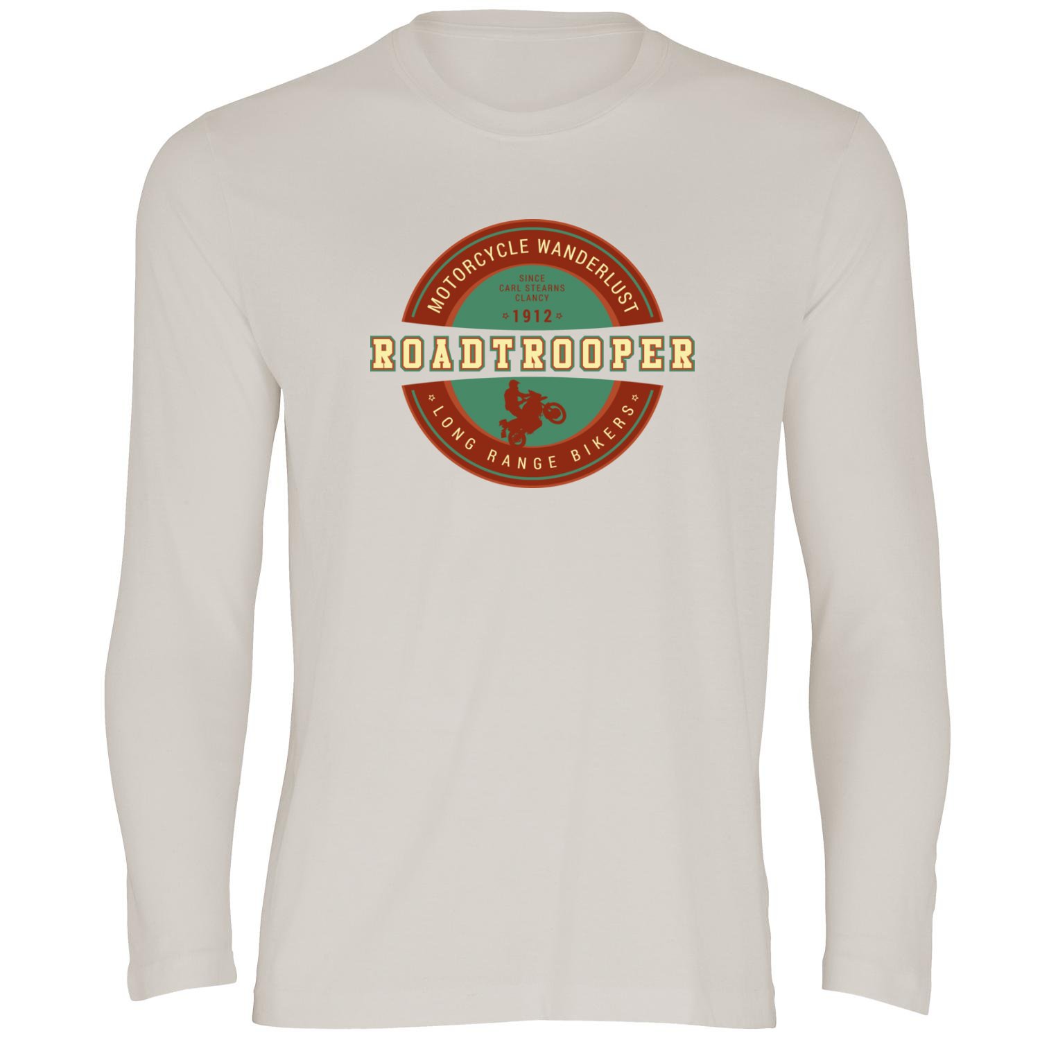 2 x high quality colour prints, the main RoadTrooper R1200GS Rider design on the chest and one small Motorcycle Wanderlust print on left sleeve.