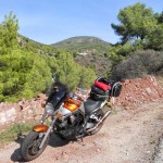 The road has been terrific so far. Just blissful riding in comfortable sunshine. Beyond this point the countryside supports less vegetation with the hills bunching together more closely. The road narrows but at least there is room for traffic in both directions. Once it plateaus, there’s only rocky hill tops and the occasional homestead all around. The long straights and easy corners allow for plenty of relaxed riding and philosophical contemplation. I no longer question my sanity for a start. This is what I came to do: See Spain in it’s most undressed and unabashed state. And it’s beautiful. I need a 360- degree camera, like those on the back of Rossi’s bike, if only I can stop thinking about the MotoGP. The views are amazing. Even the side roads beckon. I could ride around these hills all weekend.