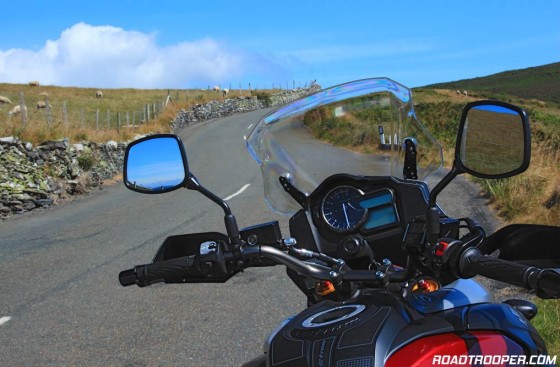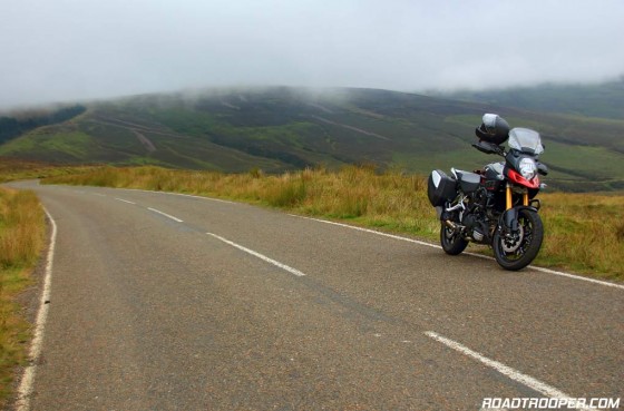 If you try this bike yourself and your taken by surprise at the massive pulling power of the V-Strom between 3,000 to 5,000rpm, like I was during one overtake, you have the security of traction control which has 3 settings, level 1 “the lowest” level 2 “the most invasive” probably perfect for wet greasy roads, and off. Make sure traction control is set to level one for a test ride in dry conditions. This traction control was also an eye opener for me to it’s purpose. During the overtake I pulled on the throttle as I would my F800GS which resulted in me being sling shot past the car quicker than my Tiger 800 could have done, firing me from 30mph to 75mph far quicker then I was expecting. At around 65mph (and still rapidly accelerating) while in 3rd gear I felt the front wheel lifting and a hint of the back loosing traction and kicking to the right. But before my conscious brain registered the danger and instructed my grip to lay off the steam the traction control (set at level one – the least invasive setting) magically and without fuss settled the V-Strom back into a controlled, well planted over-take. From this experience I will be re-evaluating my slightly negative opinion of rider aids on high torque bike models because as this experience shows, even an experienced rider of any skill level can get caught out. Note to self; there is a big fecken difference between a 798cc parallel twin and a 1037cc v-twin.