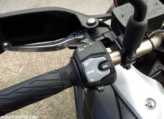 The mirrors I have to say I don’t find attractive. What they are however is a lesson in usability and practicality over visual design, the result being “while not pretty” they are possibly the most effective mirrors I’ve ever seen screwed to a bike. I’d happily swap the fashion conscious mirrors on my 800GS for ones that work this well. Initially I also found the lower digital readout a little small and cluttered as there is a lot of info crammed in there but I soon learned to get the info I wanted at a glance. All except for the engine temperature gauge which is impossible to read and should be moved to a more predominant location. The upper digital screen holds the most important stuff, speed, gear selection and is easily readable.