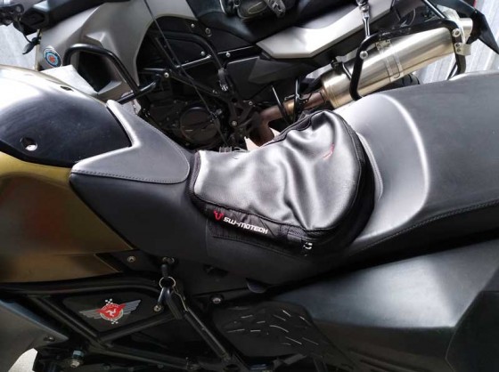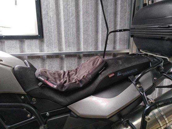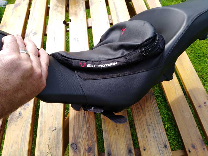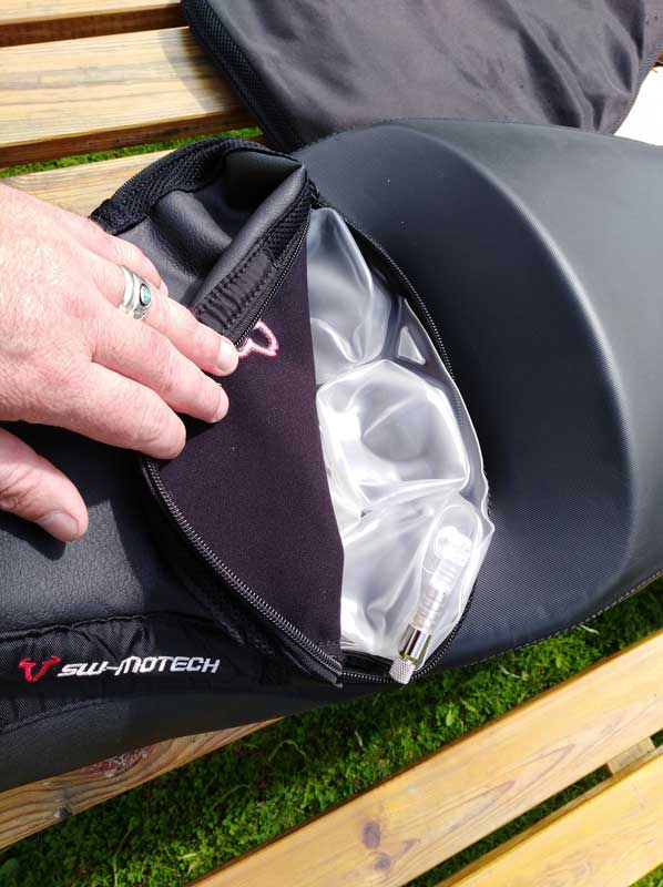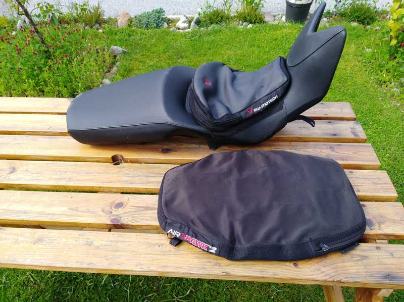The AirHawk cushion itself is stored within the SW-Motech cover, it needs only a lung full of air to work for me and works a long way better than gel pads or anything else I’ve tried..