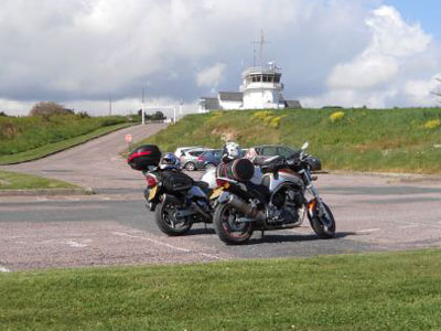 We looped around the coast along here and back around to Matignon, where we turned right and onwards towards Fort-La-Latte and then Cap Frehel where a lighthouse stands almost on the very tip of this headland. Fort-La-latte was a little busier and in the heat of the late morning sun we parked the bikes and, in my lined textile outfit and Gareth in his leathers, we trudged heavily towards this iconic castle on foot. They want money to let you in. It was enough for us to have seen the exterior, especially from a small cove we found at the bottom of the steep path that led through thickets filled with warbling birds and clicking insects.