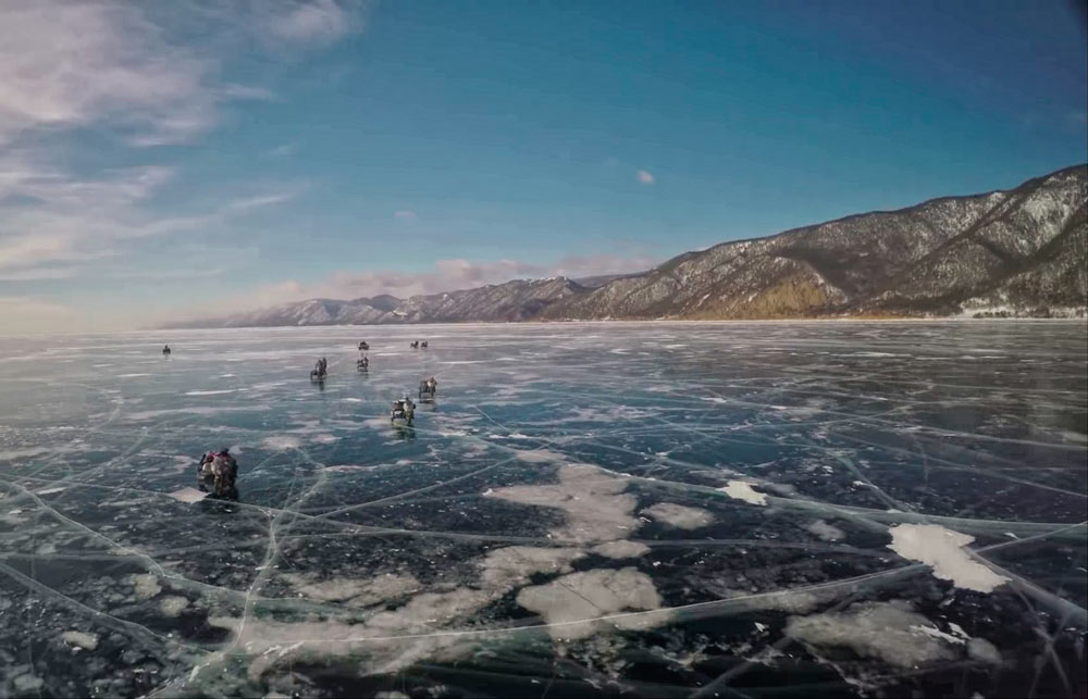 There are a few Russian vodka-fuelled parties under the stars, with Banyas, fires and feasts of local fish, thrown into the mix during the 12 day event, but the most fun comes in the form of dealing with the lake’s 12,000 square miles of ice. Parts of the ice will be sculpted by the wind and smooth as a baby’s derriere, other bits will be more like a sweaty builder’s arse crack, meaning the route across the lake certainly won’t be in a straight line. Whilst the wind can polish the ice smooth and flat like a mirror, in more sheltered areas it can resemble a freshly ploughed field, with great tombstones of ice to navigate around. If the winter is mild there will be surface water and cracks to pick a path through and sometimes jump over.