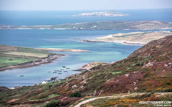 The Connemara Loop will rejoin the N59 to Clifden at Letterfrack, then past Letterfrack hang a right towards Cleggan. The Harbour at Cleggan is primarily used for fishing vessels but it’s also the ferry dock to Inishbofin if you fancy a trip to another time zone, circa the 1930′s. If not follow the route around by the lough at Aughrisbeg and back along the coast to Claddaghduff and take a right by the church where ye’ll find a little harbour. If the tide is out you’re in for a bit of fun as you can ride across the beached bay to Omey Island, but watch the tide or you’ll have to do a Jesus imitation and ride on water to get back.